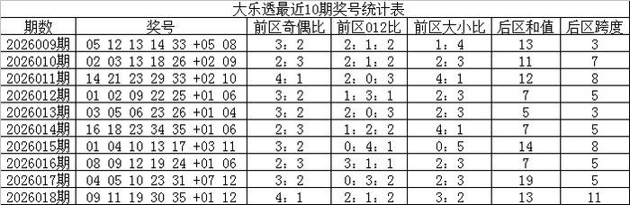 大乐透第2026018期奖号为:09 11 19 30 35+01 12。当期前区奖号012路比为2:1:2,冷热比为1:4,没有开出重号和连码,后区开出一奇一偶、一大一小组合。