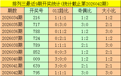 一、排列三第2026042期开出号码795,其奇偶比为3:0,大小比为3:0,号码012路比为1:1:1。该号码直选历史上出现了9次。