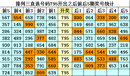 四、排列三直选号码795历史上开出9次,其前后五期奖号分别为: