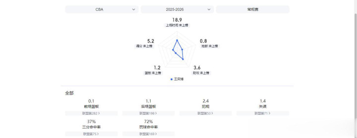 本赛季半程过后,王奕博场均仅能为青岛男篮贡献5.3分1.3篮板3.6助攻,同时场均还能出现1.4次失误和2.4次犯规。而在过往的20次出场中,他得分上双的比赛也只有4场。