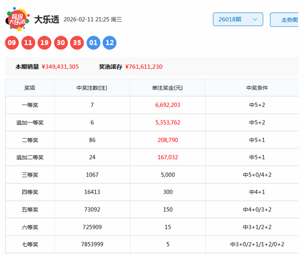 大乐透第2026018期开出奖号为:09、11、19、30、35+01、12。其中前区奇偶比为4:1,三区比为2:1:2,大小比为3:2,后区开出一奇一偶组合。
